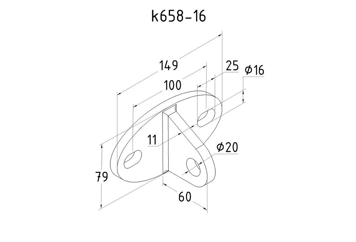 Крепление тяги к стене. Литая, полированная деталь. Состоит из крепёжного элемента с двумя овальными технологическими отверстиями 16,3 на 25 мм для крепления к стене и выносной части с отверстием диаметром 20 мм для крепежа наконечника тяги. Выполнена из стали AISI 316. Ширина детали – 150 мм, расстояние между центрами крепёжных отверстий – 105 мм. Выносная часть выступает на 48 мм от стены.