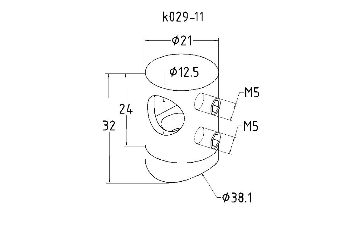Предназначен для крепления нержавеющего ригеля Ø12.8 (тетивы, струны) к стойке диаметром 38.1 мм ограждения с ригелями.