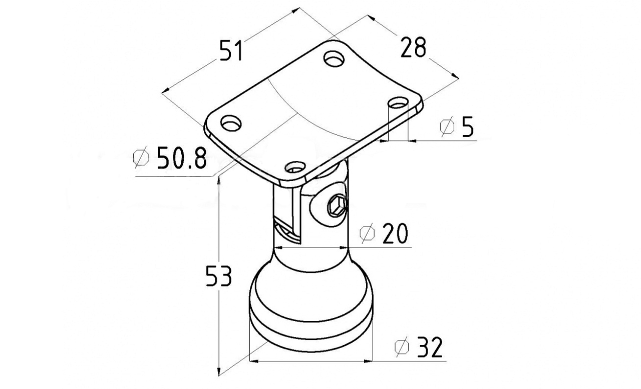 Наконечник стойки "колокольчик" на плоскость, с регулируемым ложементом с отверстиями под поручень диаметром Ø50.8 мм. Деталь литая, полированная, нержавеющая. Марка стали - AISI 304