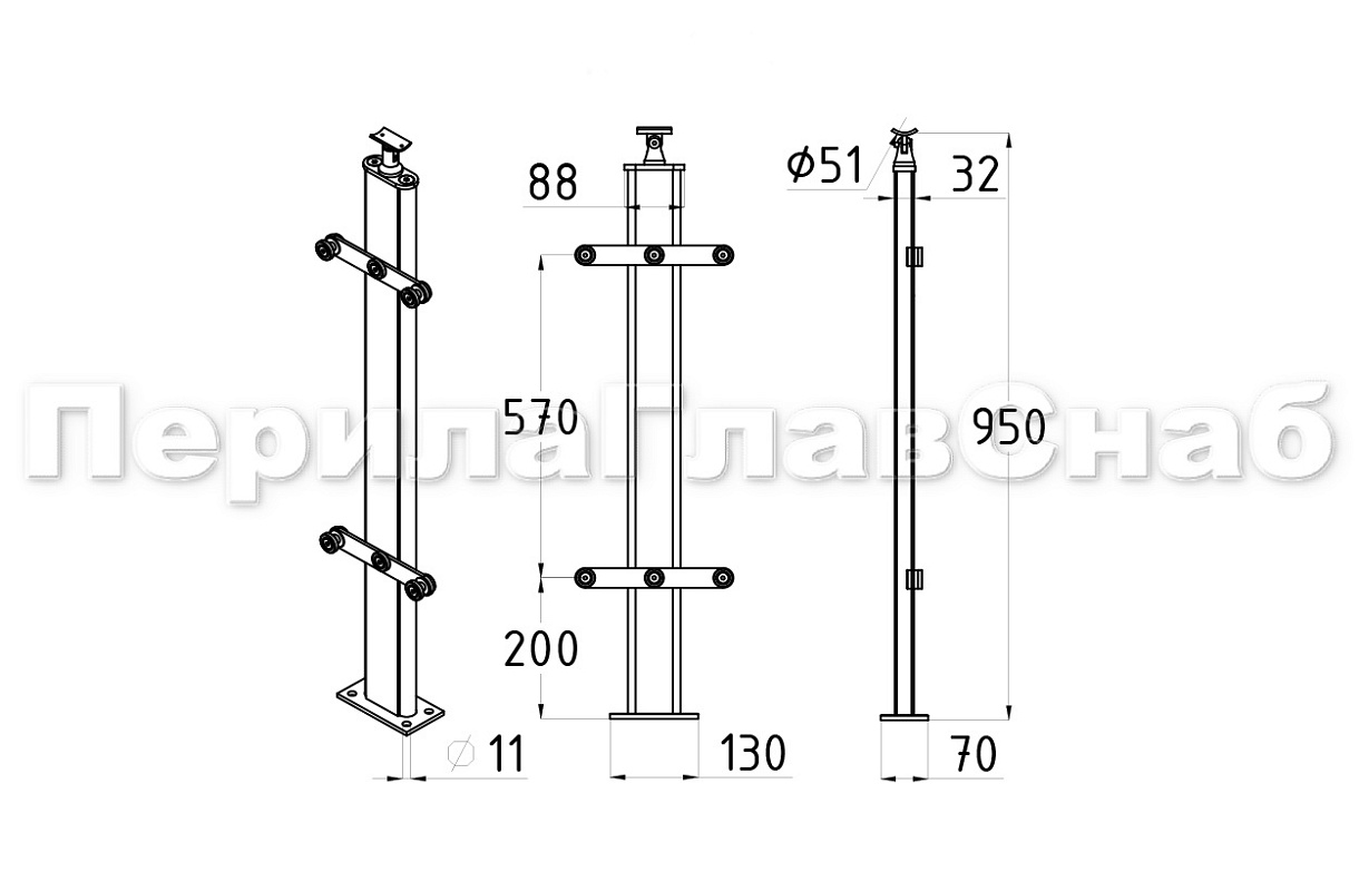 Стойка в сборе с деревянными вставками из дуба на 4 анкера шлиф. с 2 пластинчатыми стеклодержателями