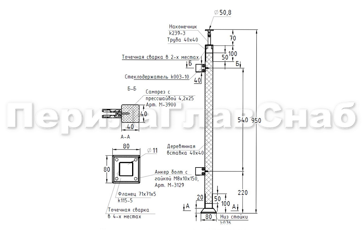 Готовая стойка 40х40х950 мм, деревянная, со вставками из нержавеющей стали 2х100 мм с 3 ригеледержателями k740-1-G купить в Ростове-на-Дону