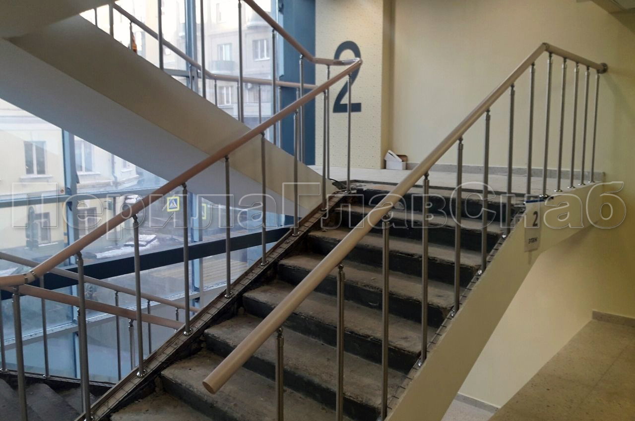 А также объемный заказ  на перила для внутренней лестницы. Заказчик предоставил дизайнерский мокап, а сотрудниками компании ПерилаГлавСнаб был идеально подобран конструктив максимально схожий с проектом. Самая большая сложность этой работы заключалась в том, что это уже действующий бизнес центр с огромным трафиком сотрудников. Бригадам приходилось максимально аккуратно выполнять монтаж. И даже порой выходить в вечернее время, что высоко ценилось клиентом, поскольку скорость работы была одной из ключевых задач. Стойки и комплектующие к ним были выполнены из шлифованной нержавеющей стали собственного производства. Поручень изготовлен из высокопрочного бука, набранный и склеенный ламелями по всей длине. Тем самым обеспечивал скорейшее высыхание древесины и не рассыхается в процессе эксплуатации. Поворотные элементы поручня склеены через штифт для повышенной стойкости, а стыки закрыты нержавеющими кольцами. Такой метод высоко оценил главный дизайнер проекта. Потому что было перекликание метала со стойками. Окрас поручня был подобран по образцам заказчика, цвет называется «Слоновая кость». Как нельзя к стати подошел к стенам интерьера. Все двенадцать этажей лестницы были огорожены триста сорока восьмью метрами погонными высококлассного и удобного в использовании ограждения. В установленный заказчиком срок двадцать пять рабочих дней.