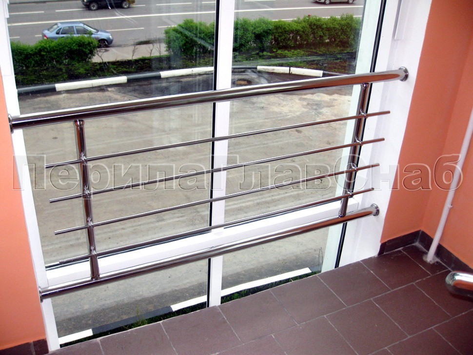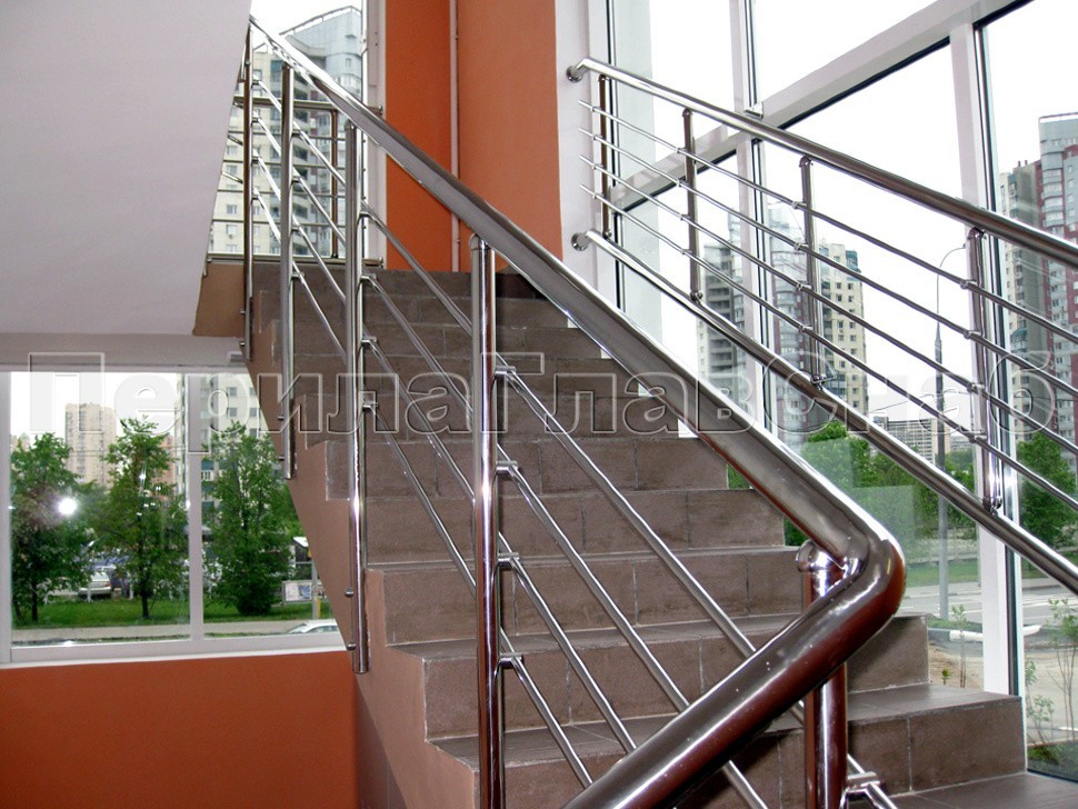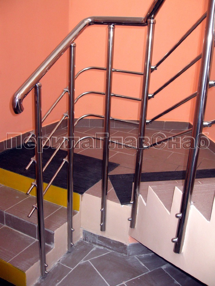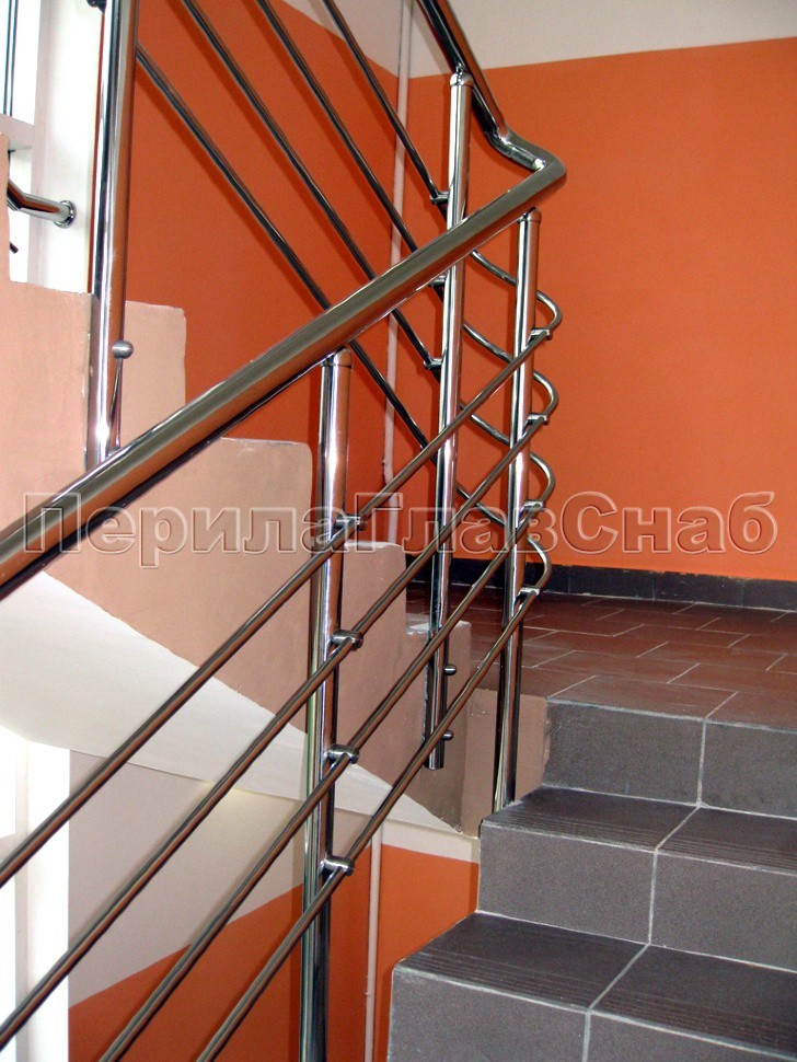 Перила из нержавейки вдоль окна и лестничного марша.Слева ограждение окна, а справа ограждение лестницы.Характерной особенностью ограждения окна является тот факт, что у него сразу два поручня.Верхний поручень служит для утилитарной и вполне традиционной цели — опоры руки идущего по лестницы человека. А вот второй (нижний) поручень нужен для опоры несущих стоек ограждения, так как они завязаны не в пол, как это делают обычно, а в стены. Таким образом, ограждение как бы «парит» в воздухе, создавая иллюзию легкости и воздушности всей конструкции в целом.