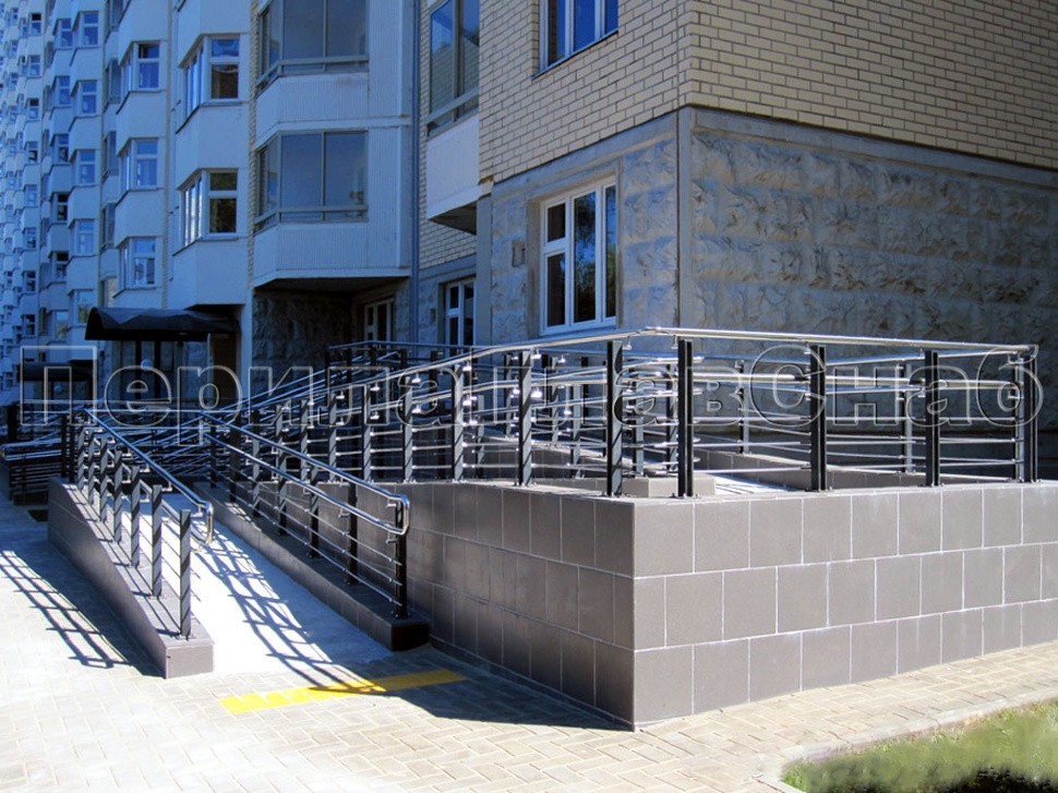 Вдоль фасада дома и у каждого подъезда были установлены входные группы и ограждения пандусов для маломобильной категории граждан: инвалидов, лиц пожилого возраста и детей.