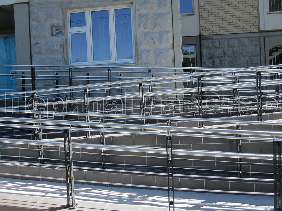 Благодаря такому неординарному дизайнерскому решению, удалось создать визуальный акцент на нержавеющем полированном поручне ограждений, а также отдельно и тонко подчеркнуть расположенные параллельно нему ригели или как их ещё называют «тетивы» или «струны» из трубок меньшего, чем поручень диаметра, заполняющих пространство между поручнем и уровнем пола или земли.