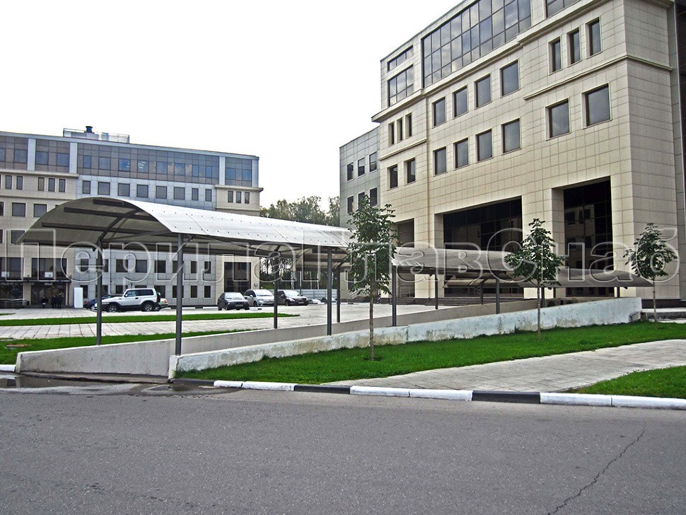 Каскад из трех козырьков с поликарбонатом над въездом в подземный гараж.В качестве опор использованы колонны из окрашенной нержавеющей стали.