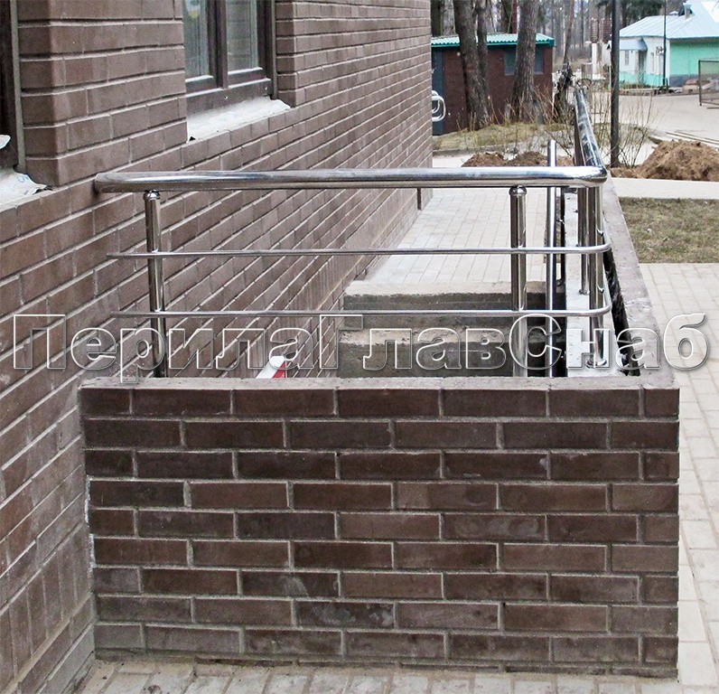 Ограждения для пандусом со сдвоенным поручнем ( выносное крепления для верхнего и нижнего поручня) и с ригелем для увеличения жесткости конструкции. Ограждение пандусов полностью соответствует ГОСТ.