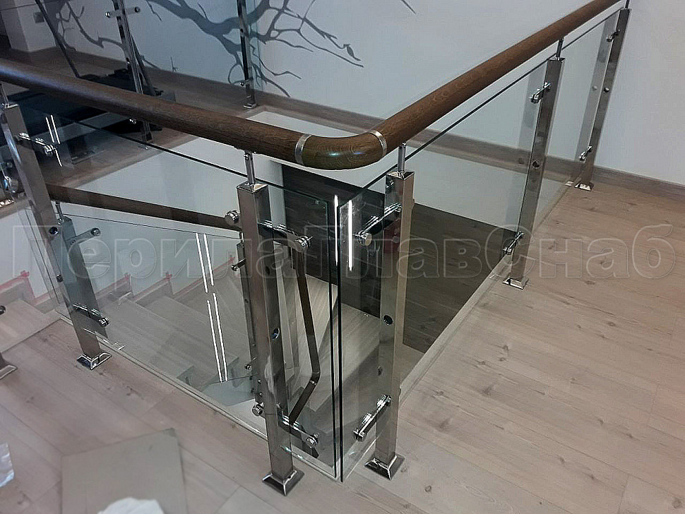Создание визуализации проекта помогает лучше понять, какую лестницу вы бы хотели видеть у себя дома. Пожелание нашего клиента было создание стеклянной лестницы с металлическими стойками и деревянным поручнем. У нас была задача для удобства прохождения по лестнице маленького ребенка, сделать дополнительные отверстия в стойках, чтобы можно было провести дополнительный тросик. Мы постарались учесть все требования и пожелания. Установили стойки с торца, тем самым сохранили как можно больше пространства на лестнице. А благодаря нашим металлическим комплектующим лестница получилась очень элегантная. Конструктив: ограждение из полированной нержавеющей стали с дубовым поручнем и стеклом по маршу в помещениях. Стекло прозрачное закаленое, толщиной 8мм., стекло крепится к стойке на пластинчатых стеклодержателях.