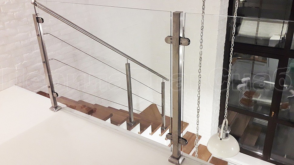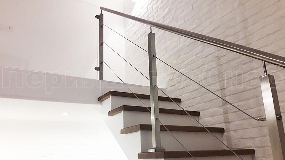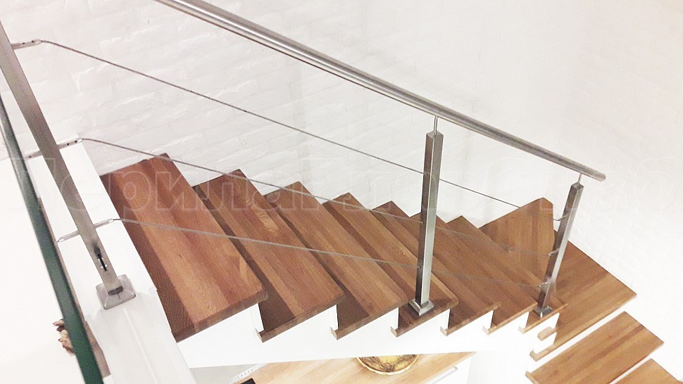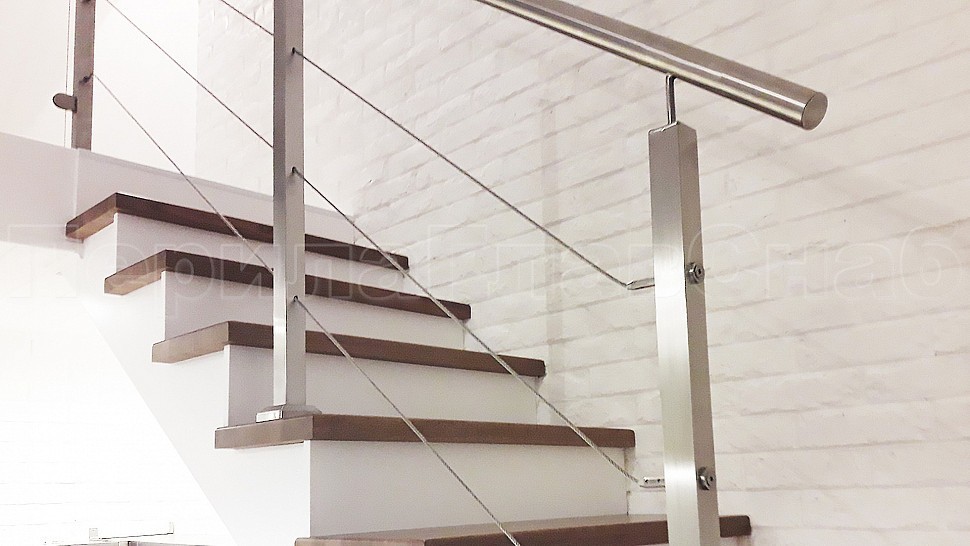 Ограждение лестницы по маршу выполнена из полированной нержавеющей стали марки Aisi 201. Высота поручня 950 мм, стойки 40х40 мм крепление сверху методом алмазного бурения устанавливаются на прямых участках 1000-1200 мм друг от друга, трос проходит сквозь стойку крепится к стойке через специальные талрепы находящиеся на крайних стойках, устанавливается равномерно по высоте стойки; поручень крепится к стоике через наконечник штырь, в начале и конце поручня заглушка.