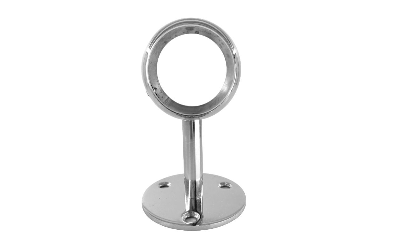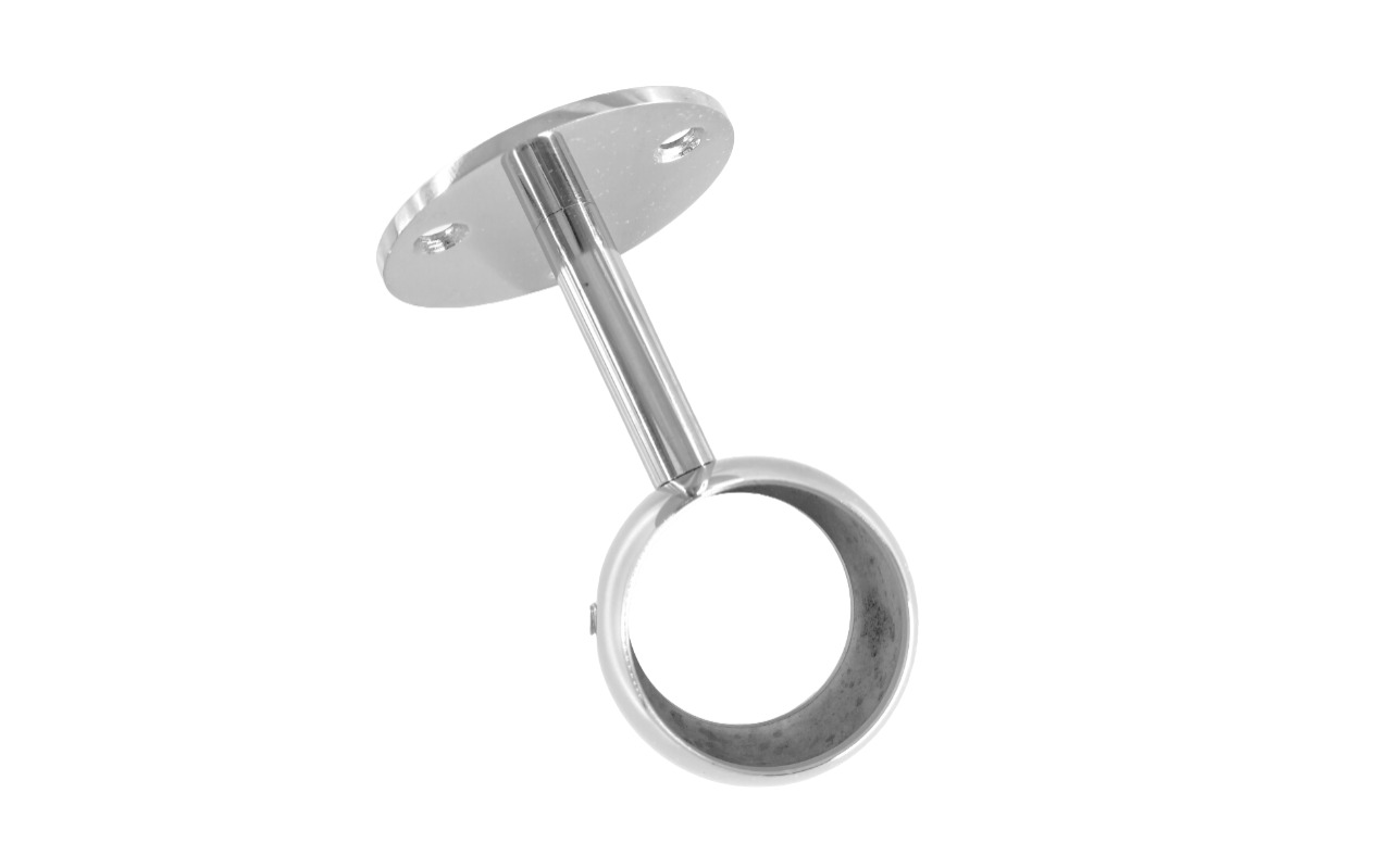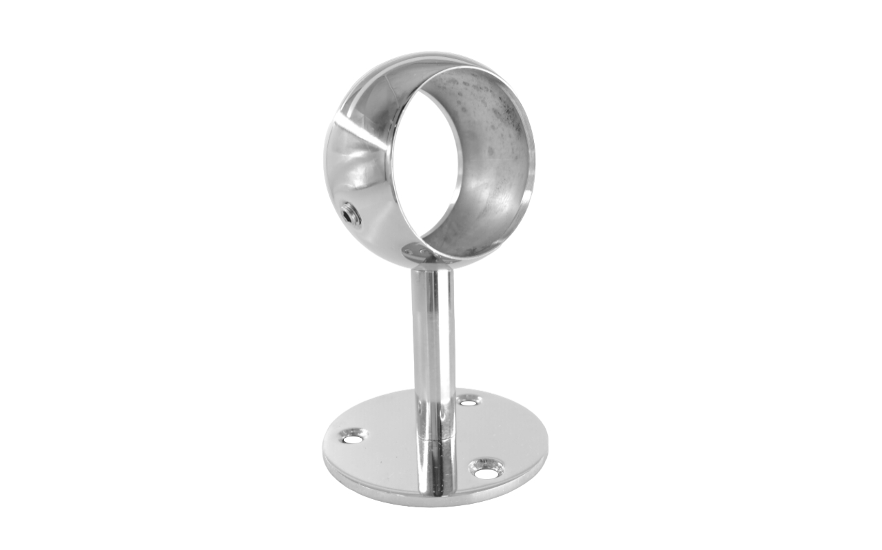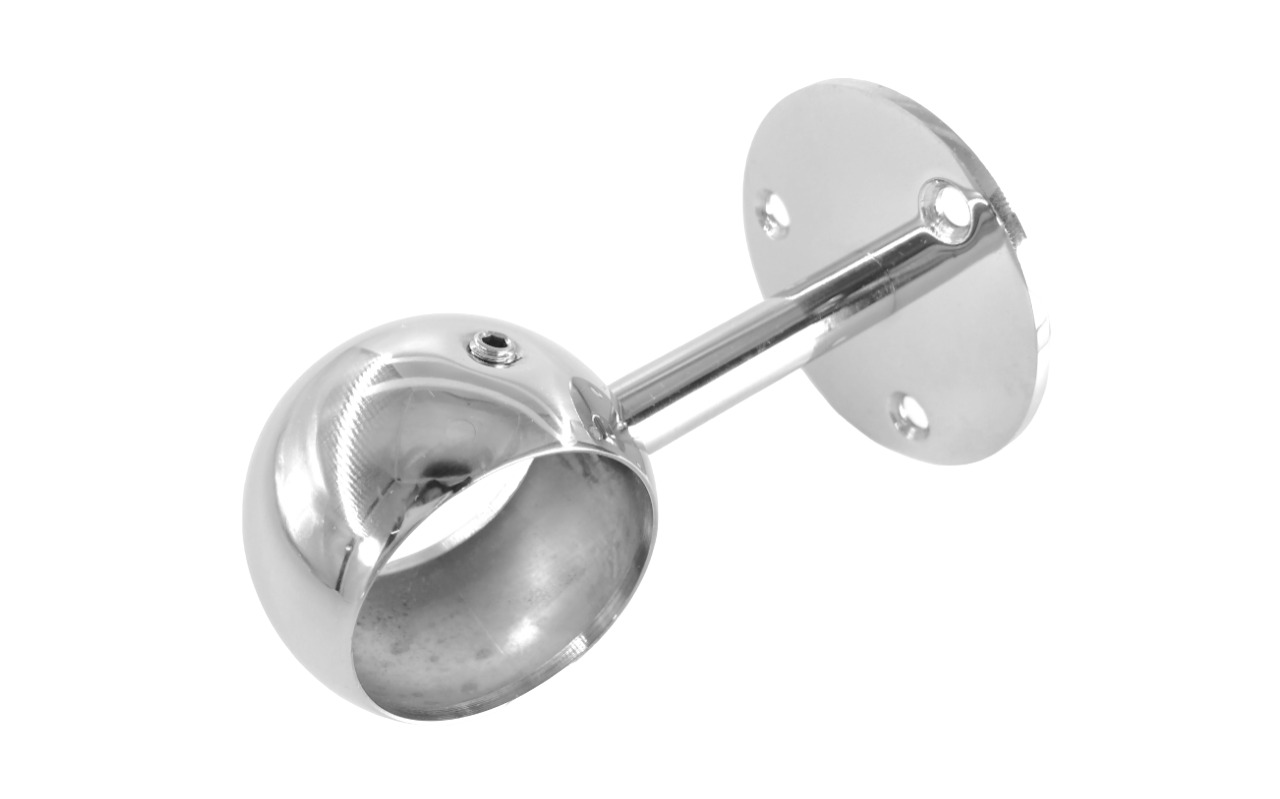 Крепление шаровидное сквозное обладает серьезным запасом прочности, благодаря толщине металла и литьевой технологии, по которой данный пристенок изготовлен. Для надежной фиксации поручня применяется обхват внутрь которого заправляется труба нержавеющих перил пристенного поручня.