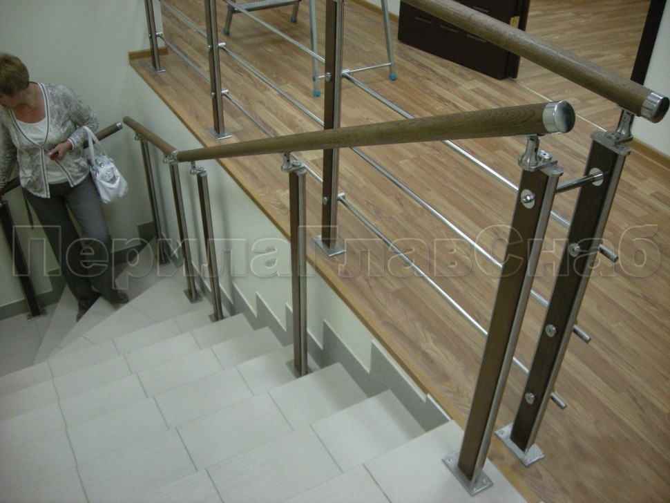 Нержавеющие ограждения без ригелей с круглым деревянным поручнем и стойками с деревянными вставками
