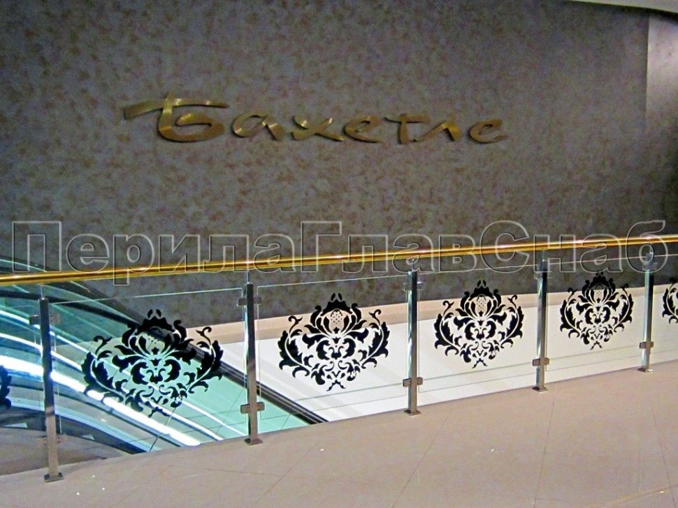 Ограждение лестницы с прозрачным стеклом, стойками и поручнем из латуни