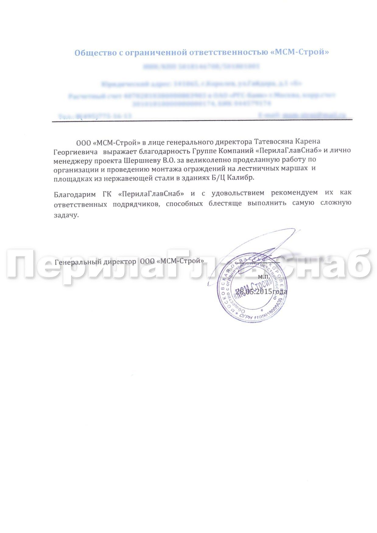 Благодарственное письмо от компании ООО «МСМ-Строй»ООО «МСМ-Строй» в лице генерального директора Татевосяна Карена Георгиевича выражает благодарность Группе Компаний «ПерилаГлавСнаб» и лично менеджеру проекта Шершневу В.О. за великолепно проделанную работу по организации и проведению монтажа ограждений на лестничных маршах и площадках из нержавеющей стали в зданиях Б/Ц Калибр. Благодарим ГК «ПерилаГлавСнаб» и с удовольствием рекомендуем их как ответственных подрядчиков, способных блестяще выполнить самую сложную задачу.